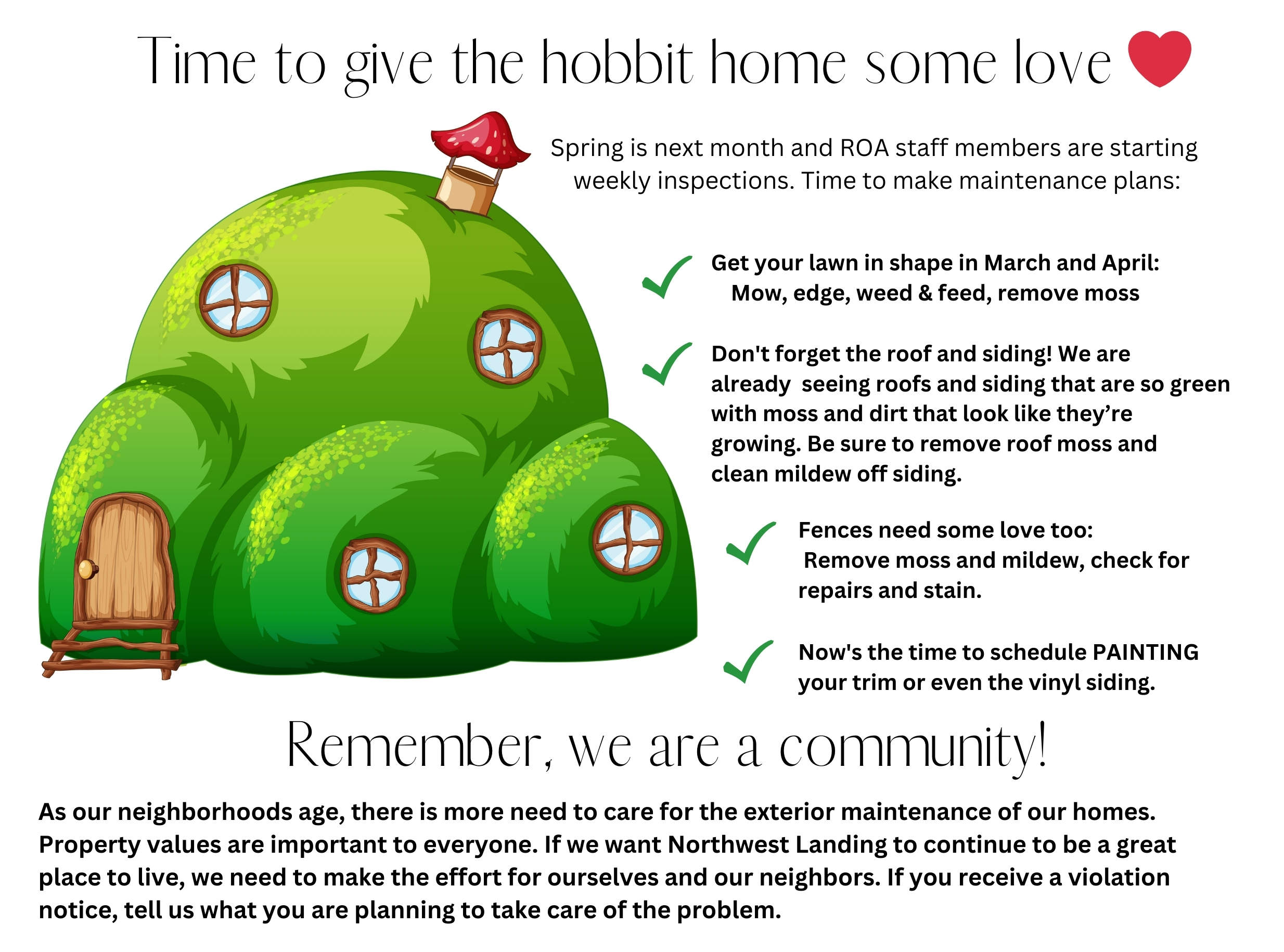 The Northwest Landing office will be closed for Presidents Day on Monday, February 16, 2026. The office will reopen Tuesday, February 17, at 9 a.m. If there is an emergency during that time, such as broken and leaking underground sprinklers, fallen tree, or snow removal needed, email the board of directors at .