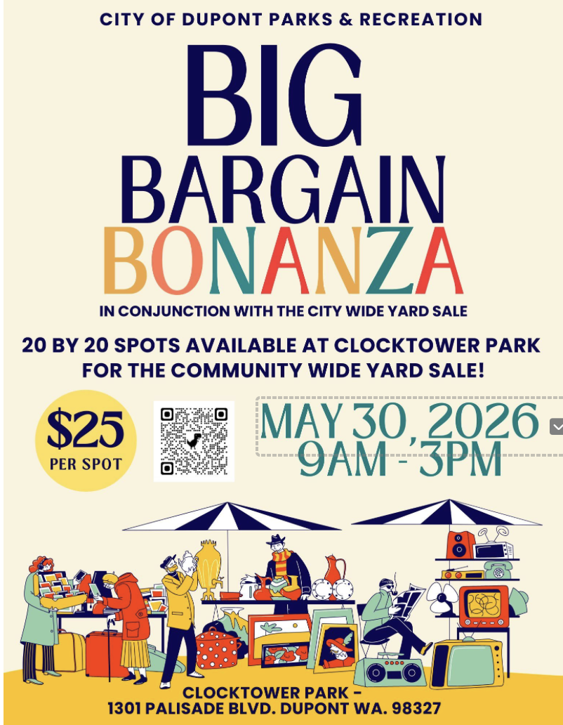 Saturday and Sunday, May 30 and 31, and Saturday, September 12, are the yard sale dates for Northwest Landing this year. Please note that yard sales are not sponsored by either the Northwest Landing ROA or the City of DuPont. Governing documents for Northwest Landing state that yard sales may be held two times a year and are announced by the ROA. If there is enough interest to hold a two-day yard sale in September, we will announce that later this year. The City of DuPont is hosting Big Bargain Bonanza at Clocktower Park on May 30 with 20-by-20-foot spaces for $25.