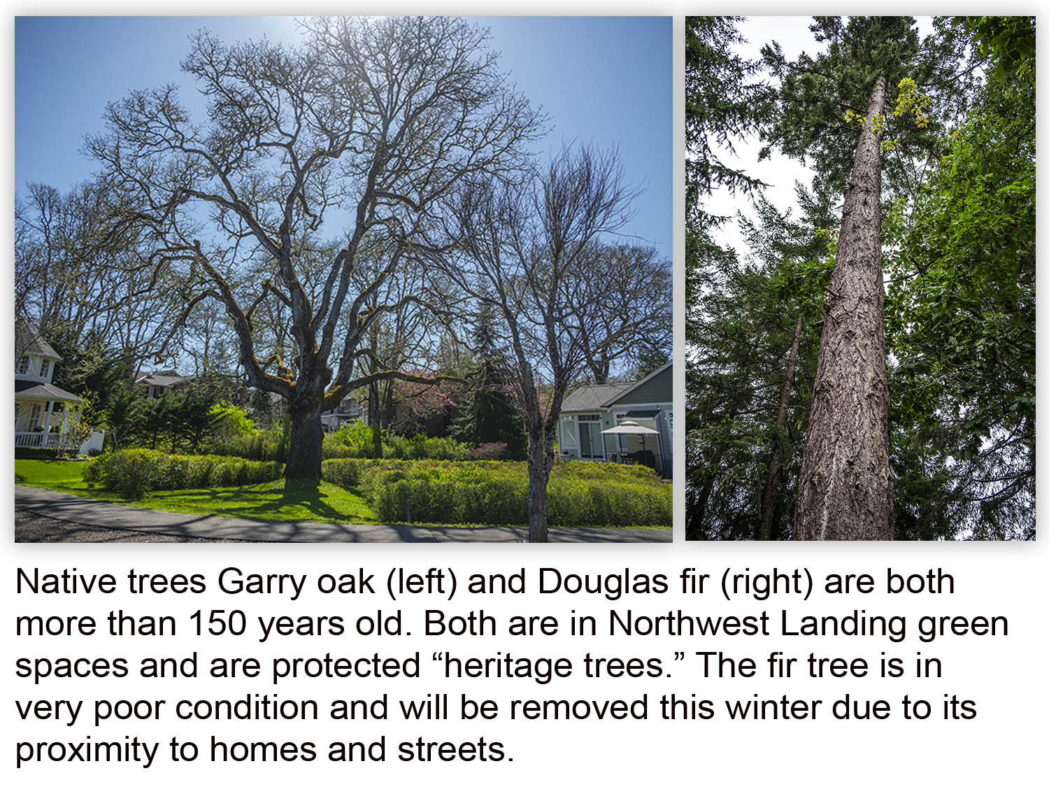 Costs have gone up, especially since many of the ROA properties are more than 25 years old. Irrigation systems need to be upgraded or replaced, along with fences and landscape plants. Pictured here are two native trees that are growing in Northwest Landing green spaces. The ROA maintains more than 152 green spaces, some with heritage trees that are more than 100 years old. Sadly, the Douglas fir will need to be cut down this winter because it is in poor condition and could fall on homes or the street next to it. Removing this tree will cost more than $15,000.